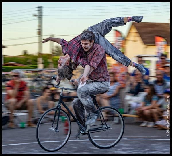 • Cirque, duo sur vélo acrobatique. Corps en équilibre qui voltigent, s'empilent, trébuchent. Un morceau de vie sur le temps qui passe.